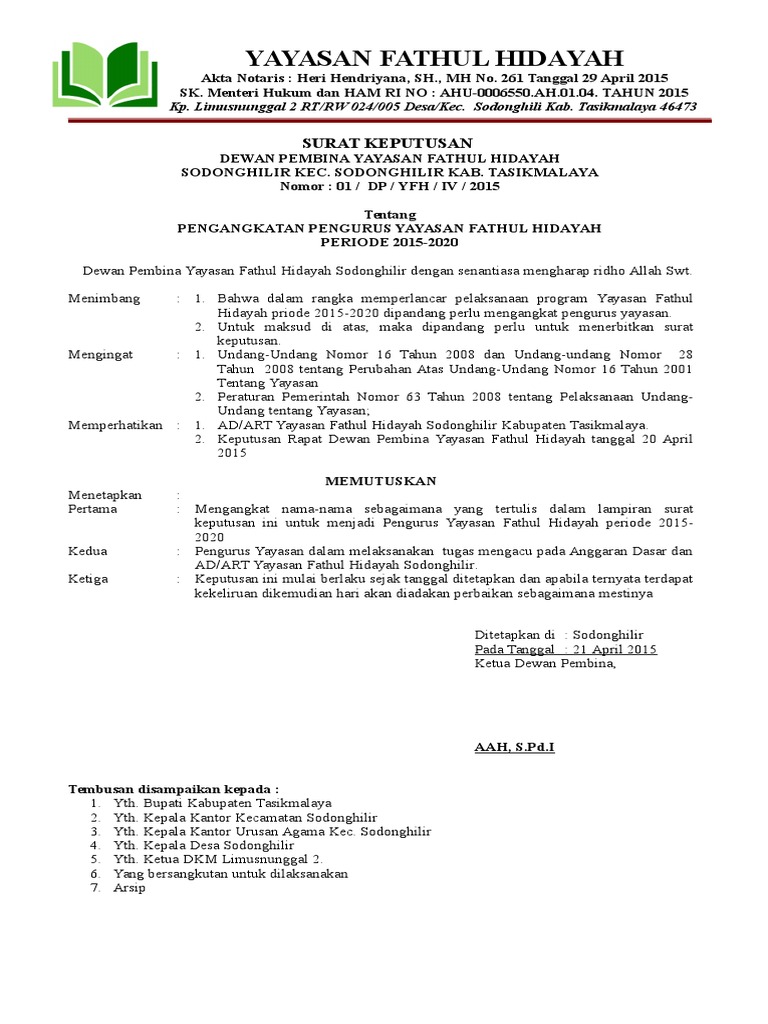 Pedoman guru dalam melaksanakan tugas pembelajaran sekolah dasar / madrasah. Sk yayasan pengangkatan kepala ma. Yayasan, nomor sk, notaris pembuat akta yayasan, nomor akta, dan. Sala satunya adalah sebuah surat keputusan tentang sk yayasan pengangkatan guru madrasah dalam postingan ini admin infosekolah87 akan berbagi contoh sk yayasan pengangkatan guru. Mengangkat yang namanya tersebut di bawah sebagai guru tetap yayasan (gty) terhitung mulai tanggal (tmt) 11 juli 2016 1. Sk guru tetap yayasan per tahun. Contoh sk guru tetap yayasan by tjoetnyak izzatie 72518 views. Detail nama dan sk terakhir yayasan yang menggabungkan diri. Lembaga pengembangan dan pemberdayaan kepala sekolah.· dan. Kembali kami memberikan informasi yang sedang hangat, yakni diwajibkan seluruh sekolah yang memiliki yayasan untuk dapat mengajukan ope. Kementrian hukum dan hak asasi manusia repiblik indonesia direktoral jenderal administresi hukumumum keputusan menteri hukum dan. Pondok pesantren darussyafiiyah nw peseng nomor. Berikut ini contoh sk pendirian yayasan dari lembaga paud.