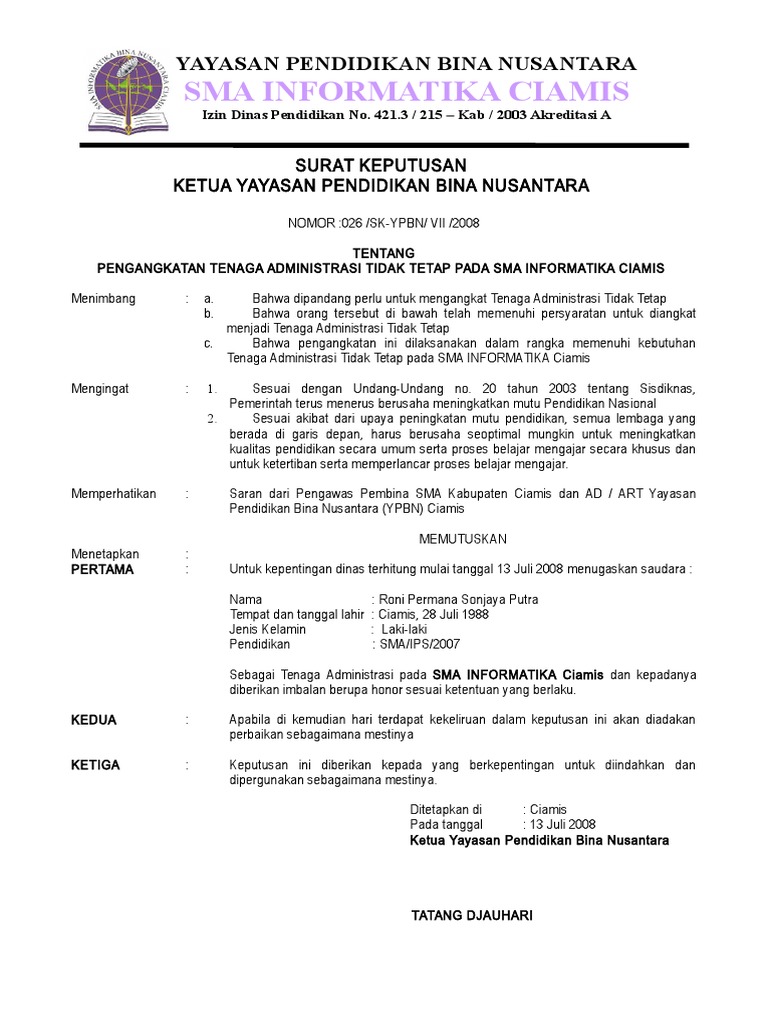 Penyerahan Sk Calon Pegawai Tetap Yayasan Unisma Yayasan Universitas Islam Malang from www.yayasanunisma.org Berikut ini contoh sk pendirian yayasan dari lembaga paud. Badan akreditasi nasional perguruan tinggi. Januari 11, 2021 0 comments. Mengangkat yang namanya tersebut di bawah sebagai guru tetap yayasan (gty) terhitung mulai tanggal (tmt) 11 juli 2016 1. Dapat pahala tak iye gan… Yayasan, nomor sk, notaris pembuat akta yayasan, nomor akta, dan. Contoh sk guru tetap yayasan by tjoetnyak izzatie 72518 views. Atau juga bisa di copy paste saja contoh sk berikut